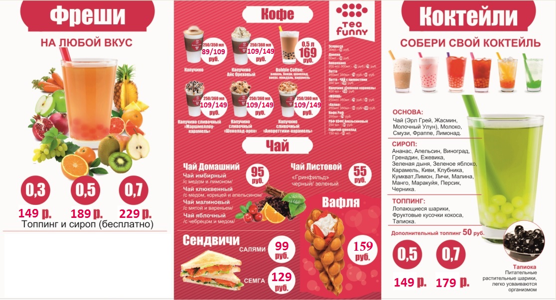 Кафе Tea Funny радует поклонников большим разнообразием позиций в меню. Оно состоит из более 2000 коктейлей с добавлением натуральных сиропов и топпингов на основе фруктов и ягод. Все коктейли не содержат сахара и готовятся на основе фруктозы или на безлактозных сливках. Яркие Bubble Tea, Bubble Fresh, Bubble Coffee, сытные Funny Sub с беконом, салями, семгой и другими начинками и холодные десерты — Bubble Ice и Frozen Yogurt — влюбляют запоминающимися вкусами.